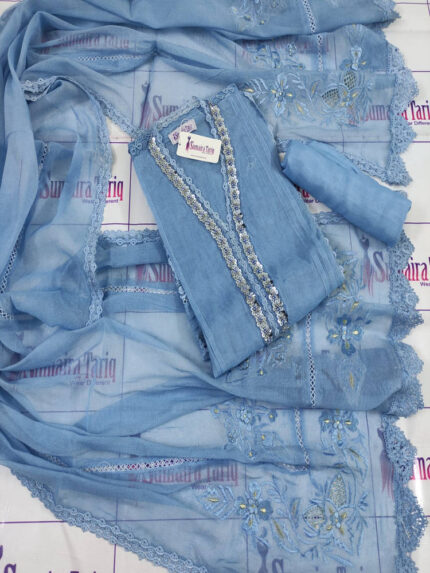 CHANDNI is an elegant and graceful 3-piece semi-stitched outfit designed in premium Khaadinet fabric. This suit features beautiful Resham embroidery and handwork detailing, giving it a classy and festive look.