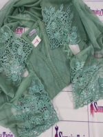 Premium 3 piece semi-stitched Slub Khaddar suit in Bottle Green color, beautifully embellished with resham embroidery and velvet applique. Comes with a ready-to-wear khaadi net dupatta, ideal for winter wear.