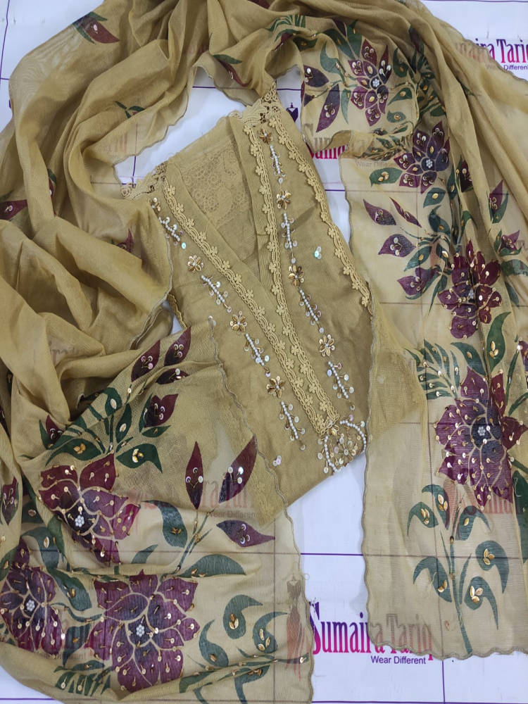 RANGRASIYA is a beautiful and graceful 2-piece semi-stitched outfit designed in premium Khaadinet fabric. This suit features pearls, sequins, handwork, and hand-painted detailing, giving it a unique and classy look.