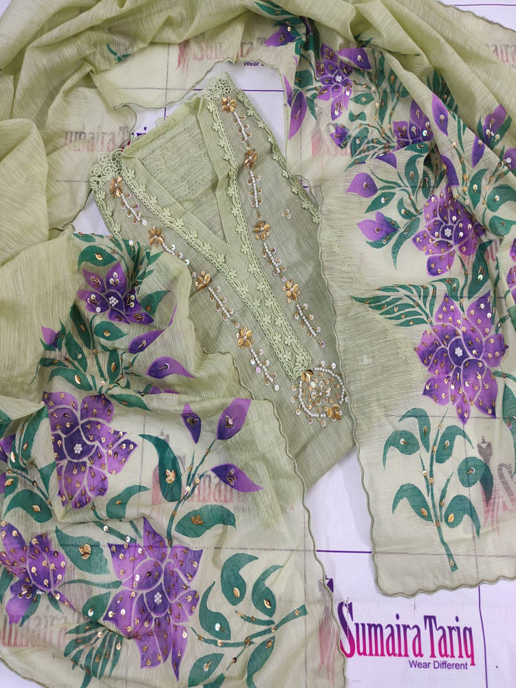 RANGRASIYA is a beautiful and graceful 2-piece semi-stitched outfit designed in premium Khaadinet fabric. This suit features pearls, sequins, handwork, and hand-painted detailing, giving it a unique and classy look.