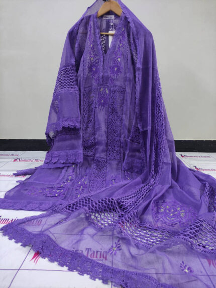 RANISA is a beautiful and stylish 3-piece semi-stitched outfit crafted from premium Khaadinet fabric. This suit features elegant Resham embroidery and cutwork detailing, giving it a classy and modern look. Once stitched, the outfit provides a perfect and comfortable fit.