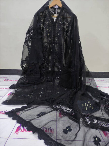 Luxury 2 piece unstitched Festive Wedding outfit in Black Reel featuring premium Khaadi Net fabric with heavy 3D embroidery and handwork.