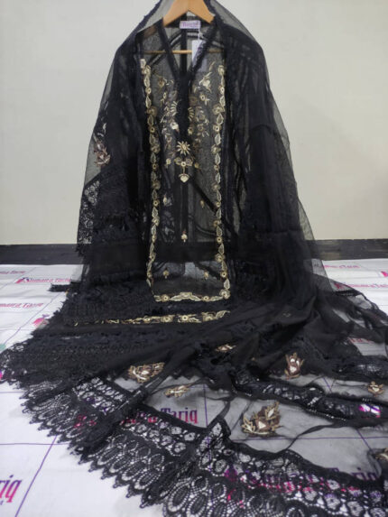 Elegant 2 piece unstitched outfit in Black Cage featuring premium Khaadi Net fabric with luxurious 3D embroidery and detailed handwork.