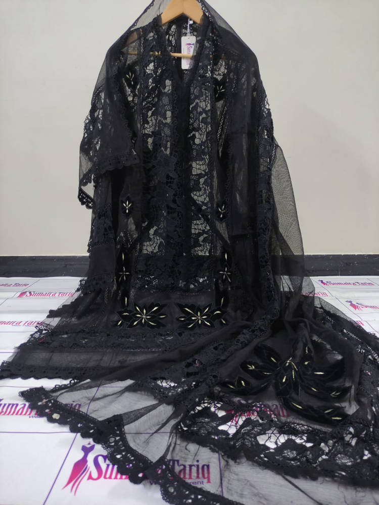 Elegant VELKARI 3 piece semi-stitched suit in classic Black color, featuring Khadi Net & crochet with Resham embroidery and velvet appliqué.