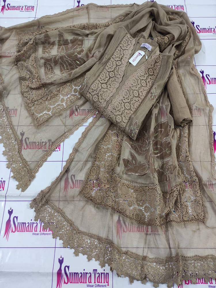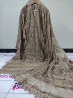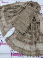 Elegant VELKARI 3 piece semi-stitched suit in Coffee Beige color, crafted with Khadi Net & crochet, featuring Resham embroidery and velvet appliqué for a premium festive look.