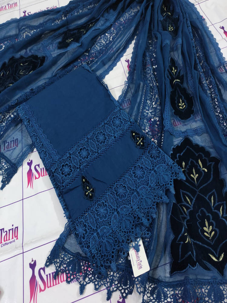 Elegant 3 piece semi-stitched Slub Khaddar suit in Peacock Blue color, featuring resham embroidery with velvet applique. Includes a ready-to-wear khaadi net dupatta with lace and velvet detailing, perfect for winter wear.